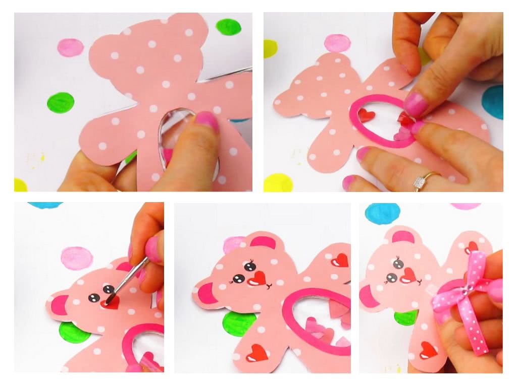 Валентинки в виде сердечек — это мило, но уже порядком приелось. Очень креативная идея сделать открытку в виде мишки с прозрачным животиком. Вы можете написать на нем пожелания или подарить прямо так, здесь нет ограничения для вашей фантазии. Можете смело экспериментировать с цветом мишки и разукрасить его как подсказывает ваша фантазия.