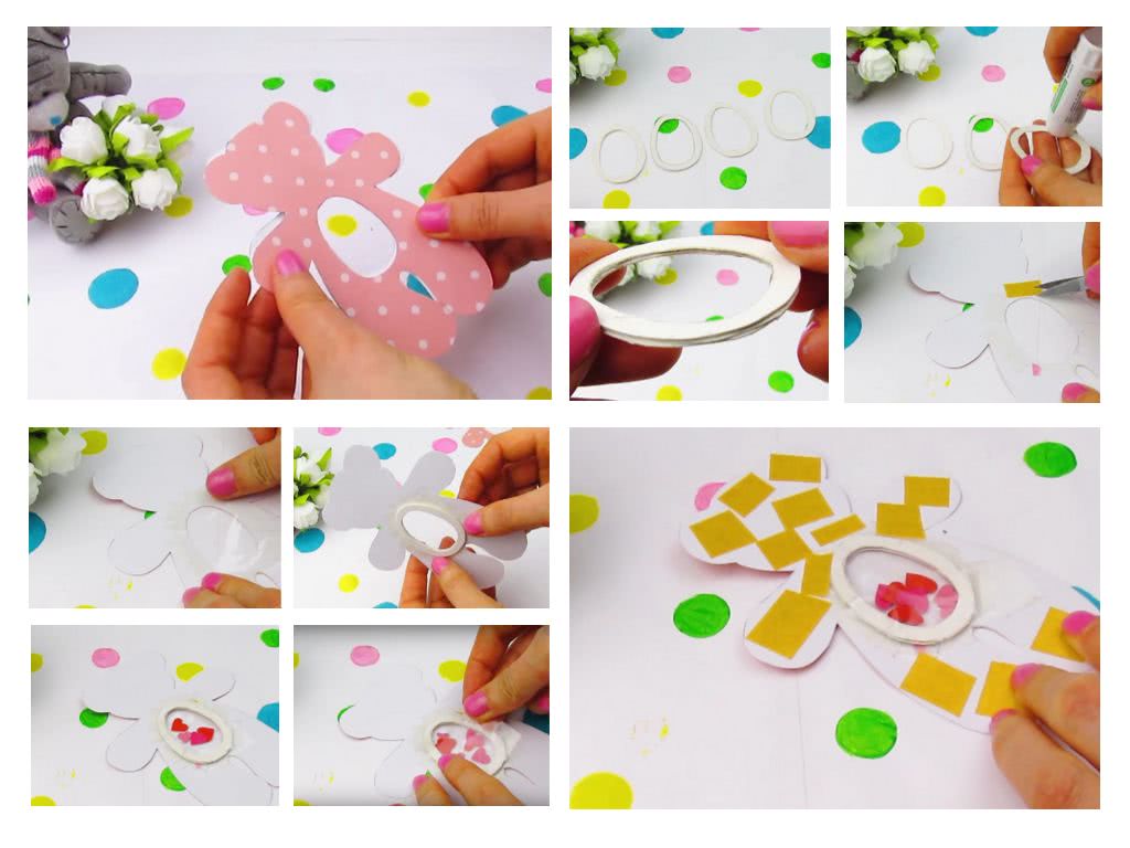 Потом приклейте на двухсторонний скотч бортик для сердечек на животик. Вырежете маленькие цветные сердечки и положите внутрь окошка, а сверху заклейте еще одной прозрачной пленочкой.