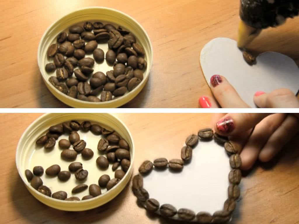 Такая валентинка отлично может быть использована как милый магнит на холодильник или красивая и стильная подвеска. А зерна кофе еще и будут дарить прекрасный аромат.