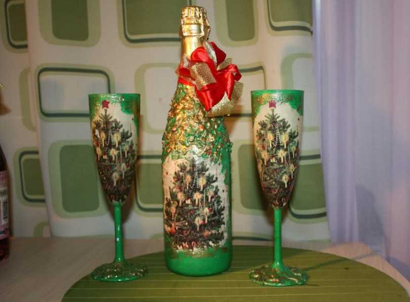 Вам понадобится: бутылка шампанского, 50 конфет Fererro Rocher, клеевой пистолет, папирусная бумага зелёного и золотистого цвета, ножницы, скотч, втулка, золотистая лента.