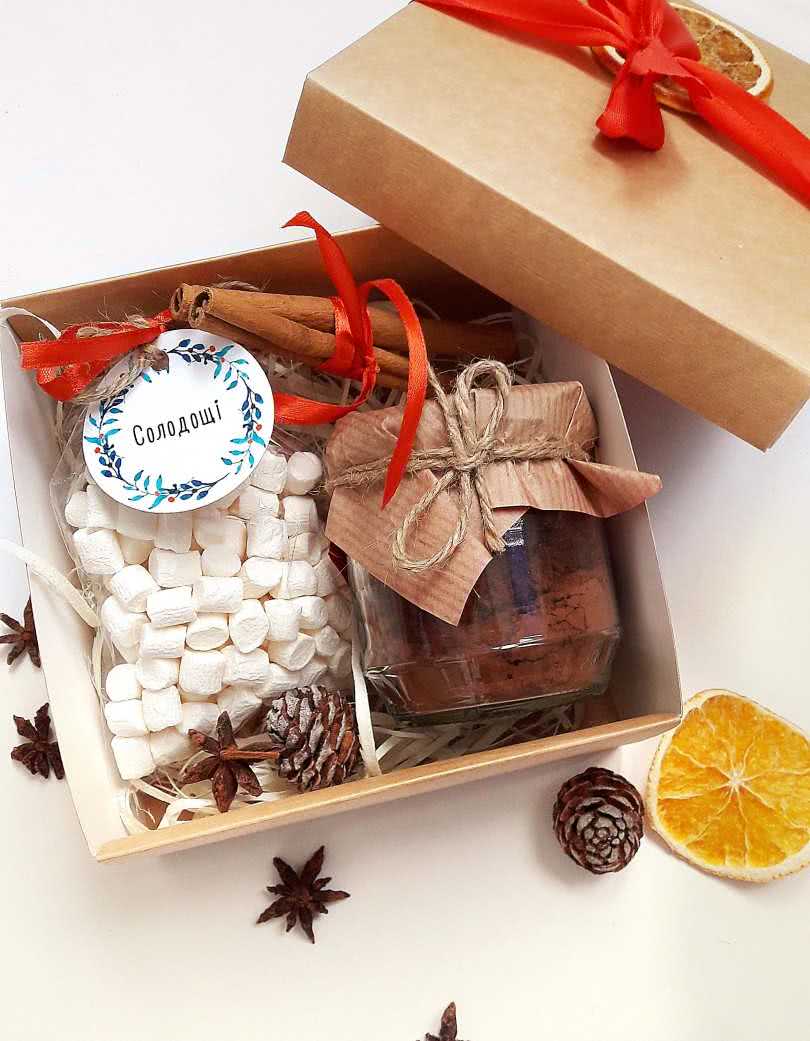 Для близкой коллеги собери мини-бокс со средствами ухода и сладостями. Наполнение коробочки зависит от бюджета – недорогой набор собирается в пределах 300-400 рублей. Например: