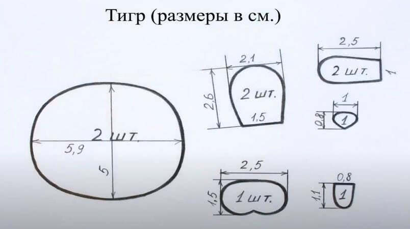Тигр – красивая и символичная новогодняя игрушка. Чтобы его сделать, нужно подготовить лекала: распечатать выкройку и вырезать ее составляющие.