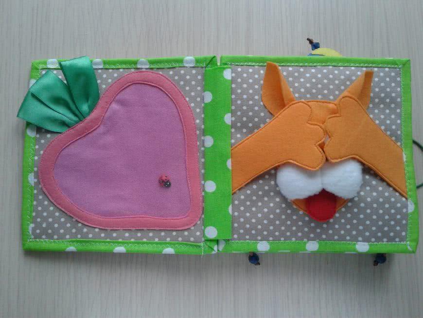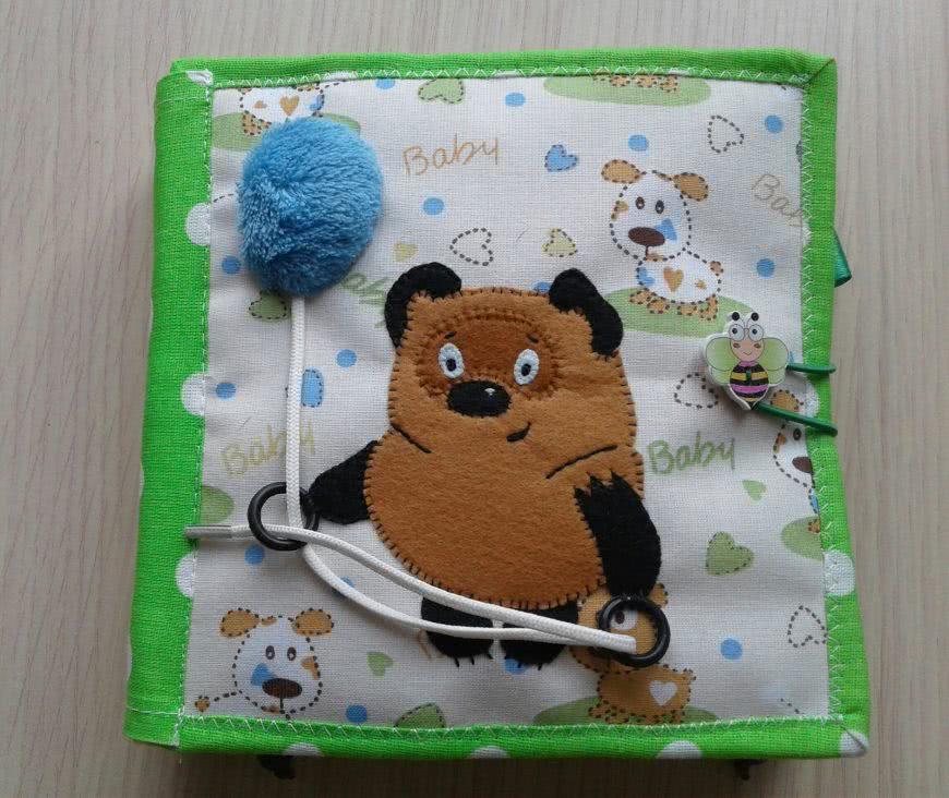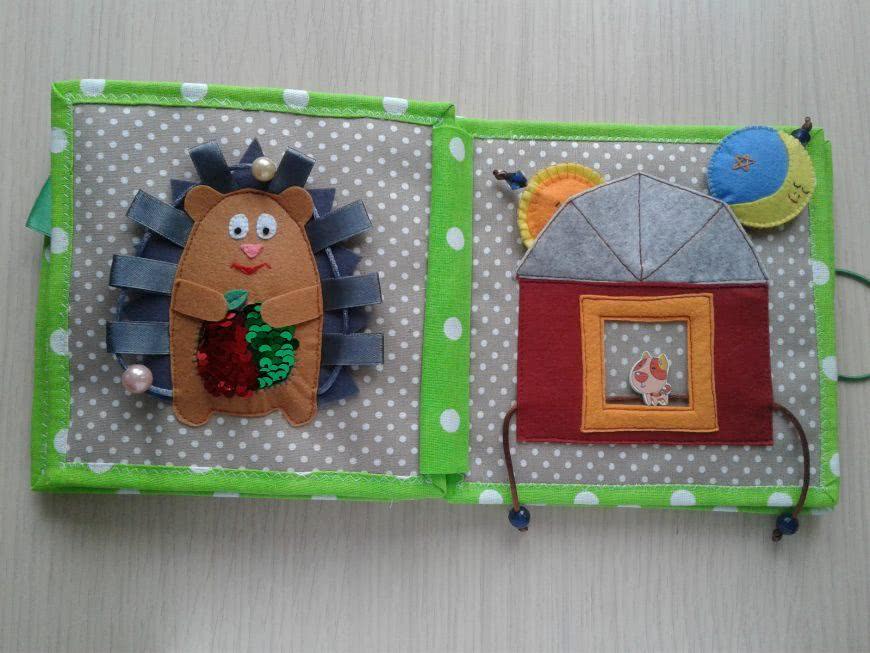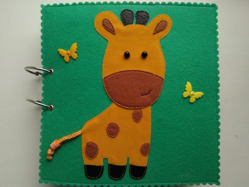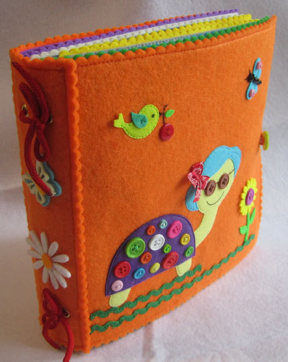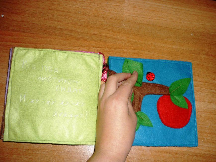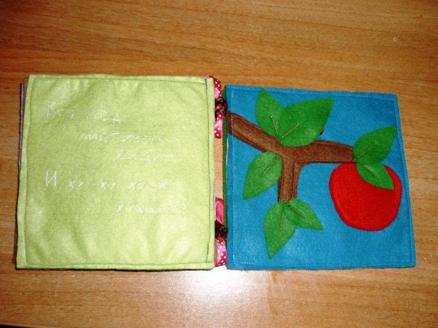 На обложке можно указать имя ребёнка, для которого она шьётся. А можно придумать специальное название для книжечки. Хотя и сама обложка может уже быть с развивающими элементами.