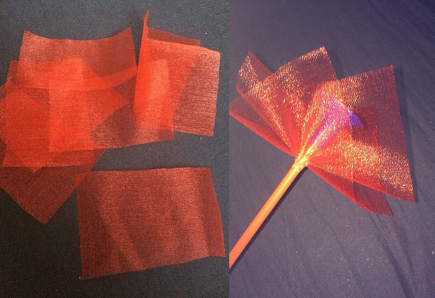 Сначала приготовьте основу, на которой будут крепиться мишки, они будут располагаться на палочках. Вырежьте из органзы по два квадрата на каждую палочку, сформируйте из лоскутков цветок и прикрепите горячим пистолетом к палочке в два слоя.
