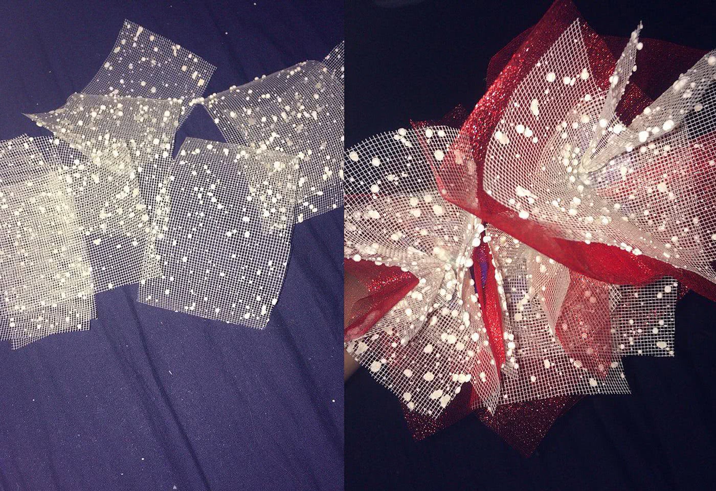 То же самое проделайте из специальной сетки для букетов и закрепите поверх органзы. Должны получиться своеобразные цветочки, как показано на фото.