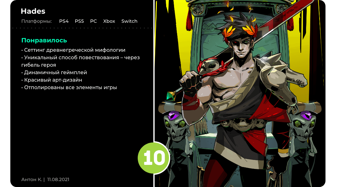 О Hades на самом деле можно говорить очень долго. Уникальность этого проекта заключается в идеальном сочетании пресловутого Эроса и Танатоса — здесь одинаково интересно как бороться за выживание, так и погибать. Каждый раз после смерти Загрея игра открывает себя с новой стороны.