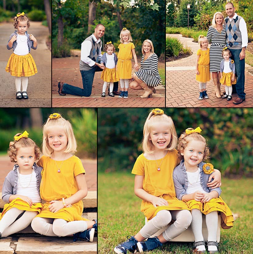 Предметы гардероба членов могут быть одного цвета или иметь три общих оттенка, к которым добавляются другие цвета. Еще один вариант: родители в одежде одного цвета, дети – другого. Многие выбирают однотонный гардероб, или используют аксессуары одного цвета.