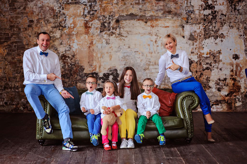 Все идеи семейных фотосессий напрямую связаны с местом проведения съемки. Фон для фотографий, наряды моделей и их позы должны гармонично дополнять общую картину. Для фотостудии, выполненной в светлых оттенках, лучше взять яркие цвета одежды. Для цветных залов – остановить выбор на однотонных и белых платьях и рубашках. На природе лучше избегать зеленых оттенков, чтобы не сливаться с травой и деревьями. В шикарных интерьерах фотостудии будут уместны классические костюмы, высокие каблуки и роскошные платья. Съемка в песочнице или парке развлечений подразумевает спортивный стиль или кэжуал.