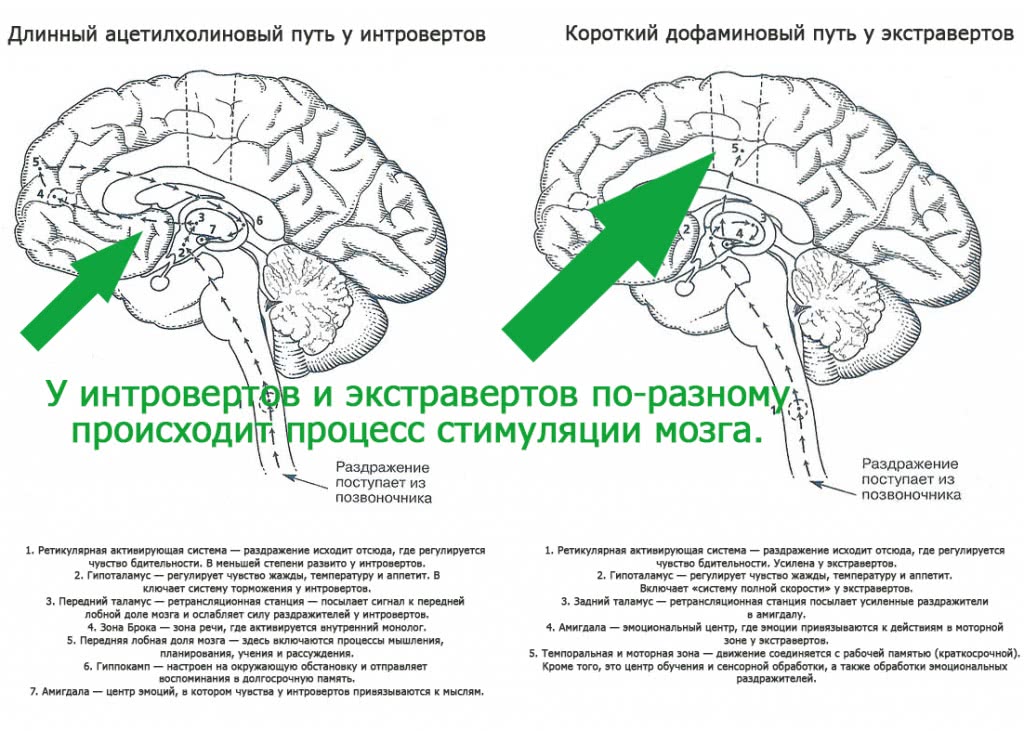 Мозжечковая миндалина отвечает за процесс эмоционального стимулирования, который в свою очередь обеспечивает прилив эмоционального возбуждения у экстравертов, когда они совершают поступки, от которых у интроверта просто «захватывает дух». Также в исследованиях было обнаружено, что различие между экстравертами и интровертами состоит в восприятии и обработке процесса стимуляции. То есть сам процесс стимуляции в нашем мозге воспринимается по-разному, в зависимости от типа личности. У экстравертов процесс переработки стимулов занимает меньше времени. Переработка проходит через область, где происходят процессы осязания, вкуса, зрительное и слуховое восприятие. У интровертов стимулы проходят долгий и сложный путь в областях мозга, ответственных за память, планирование и решение задач.