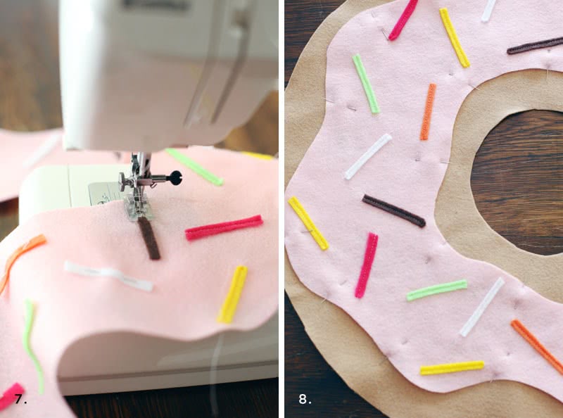В качестве посыпки используем разноцветные кусочки фетра, разрезав их на полоски небольшого размера. Прикрепляем заготовки к кругу розового цвета булавками.
