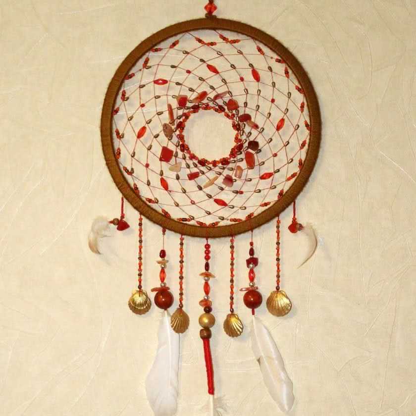 Используются различные камни, жгуты, нити, стекляшки, ленты, ракушки и всевозможные украшения для разнообразия этого защитника сновидений.