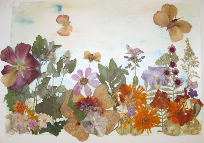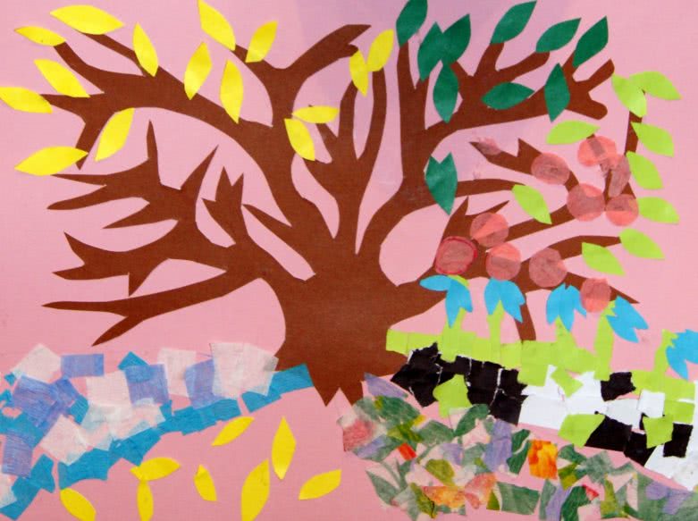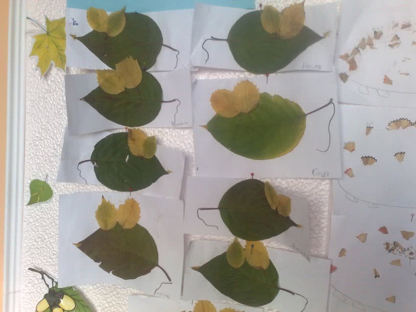 Поделка аппликация из природных материалов (листьев, коры, цветков), чаще всего, приходится на осень, когда идет период опадания пожелтевшей листвы. Тогда появляется возможность выбора разных цветов.
