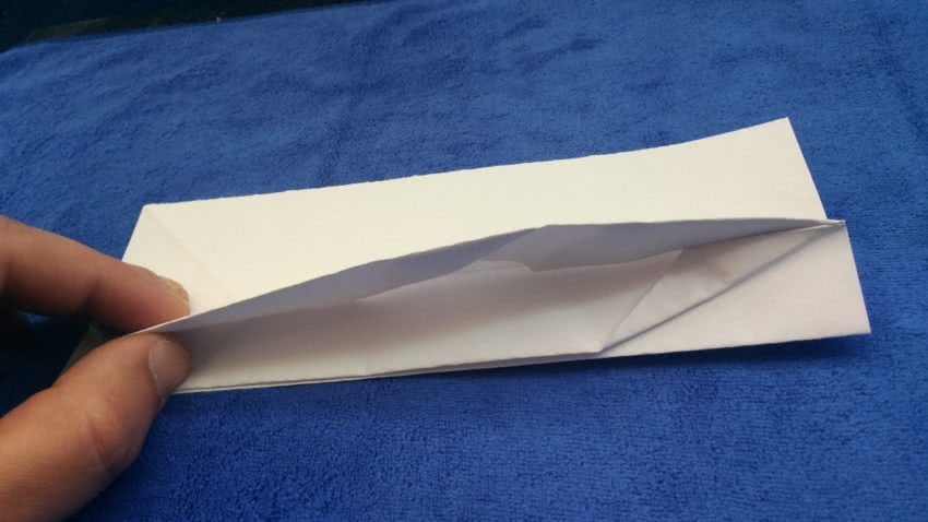 - Теперь боковые стороны нужно согнуть к середине. Лист должен лежать сгибом вверх. Сгибаются обе стороны до середины, они должны сомкнуться между собой, но не лечь друг на друга. Внизу должна остаться небольшая выступающая часть;