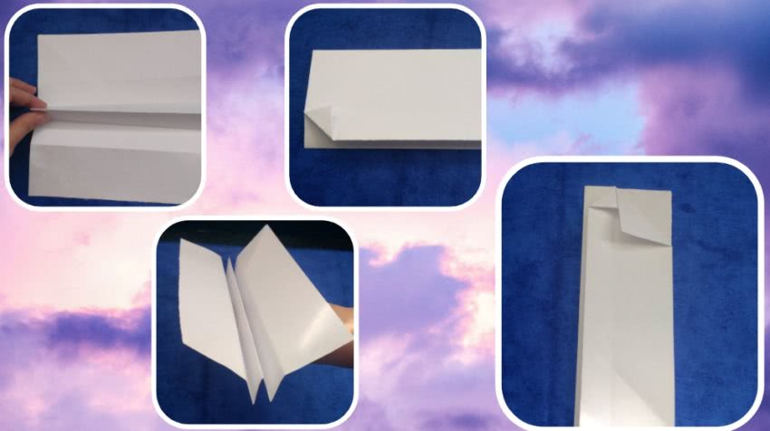 - Загните в верхней части листа два угла внутрь, чтобы они сошлись по центру. Один уголок будет двойным, второй — одинарным.