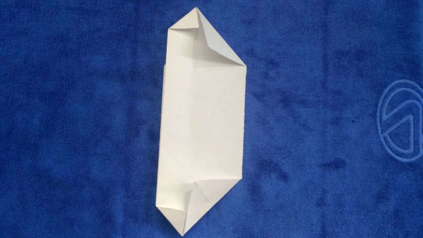 Две свободных стороны надо согнуть по диагоналям, а затем взять изделие за края и растянуть в разные стороны. На этом классический вид детского кораблика будет полностью готов.