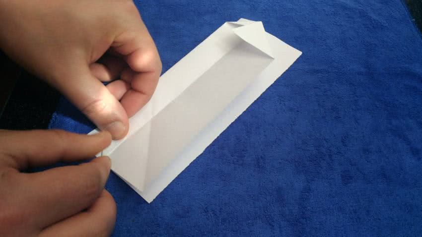 - Теперь согните верхний двойной уголок с противоположной стороны и сверните заготовку по линии сгиба. Проработайте сгибы и накройте оставшейся частью листа, чтобы края бумаги совпали.