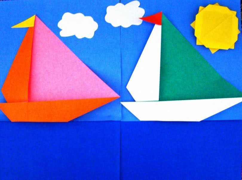 Предлагаю испробовать вариант попроще и парусник у него не такой большой как в предыдущем, но благодаря цветной бумаге сделать его можно очень оригинально. И каждый кораблик изготовленный по такой технике будет индивидуален, красив по своему.