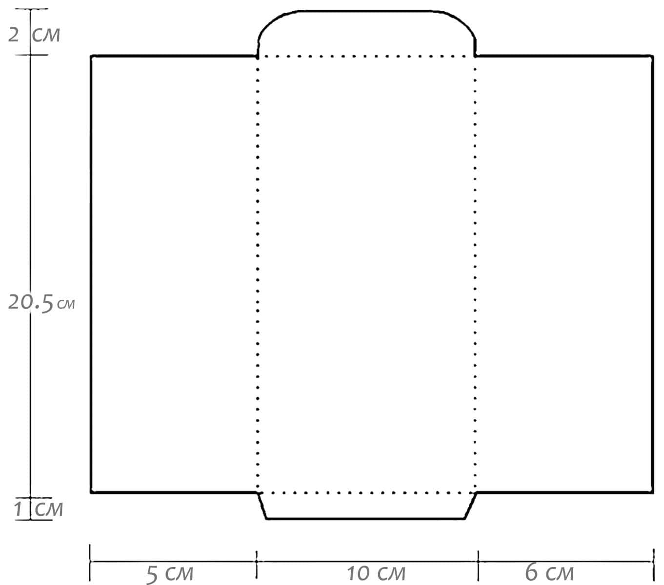 А чтоб у вас получился обыкновенный прямоугольный конверт, нужно разметить на нем выкройку, как на схеме (кликните на картинку для увеличения, после чего можно скачивать).