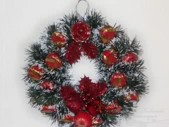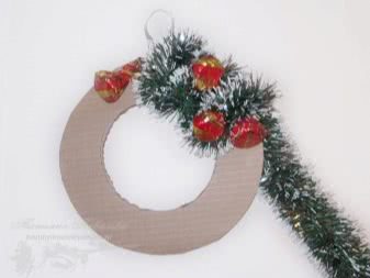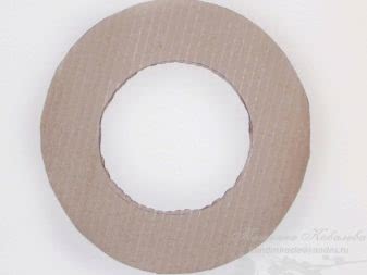 Сделаем картонную заготовку в виде кольца и обмотайте ее красной лентой (шириной 2,5 см), а также украсьте заготовку золотой тесьмой.