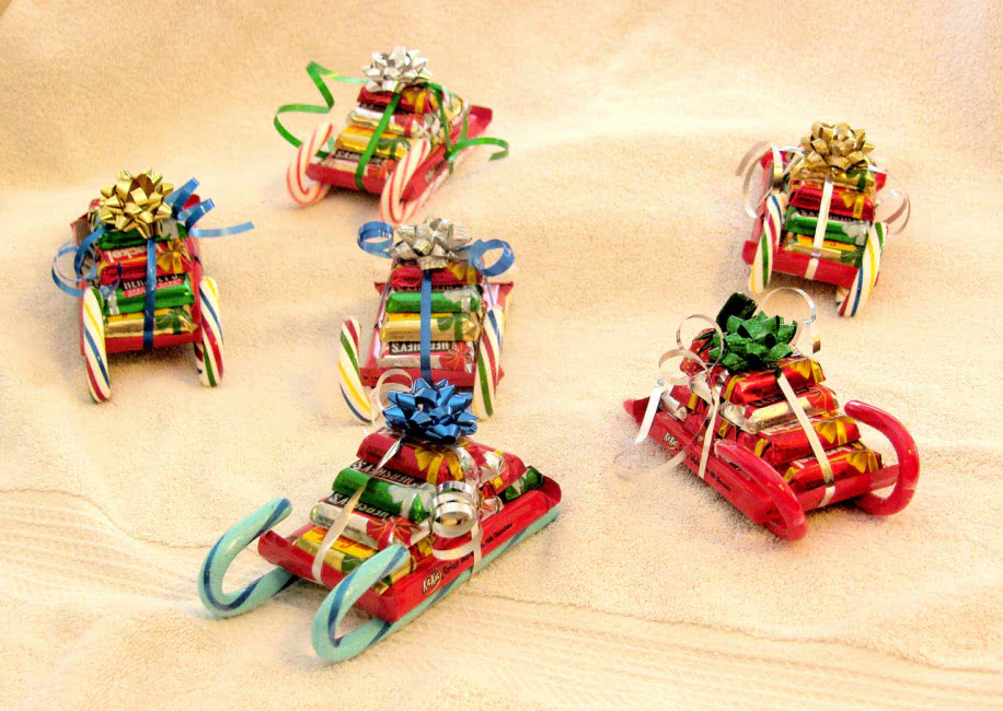 Каждую конфетку стоит зафиксировать небольшим количеством клея. Затем перевяжите сани лентой. Украсьте композицию бантом.