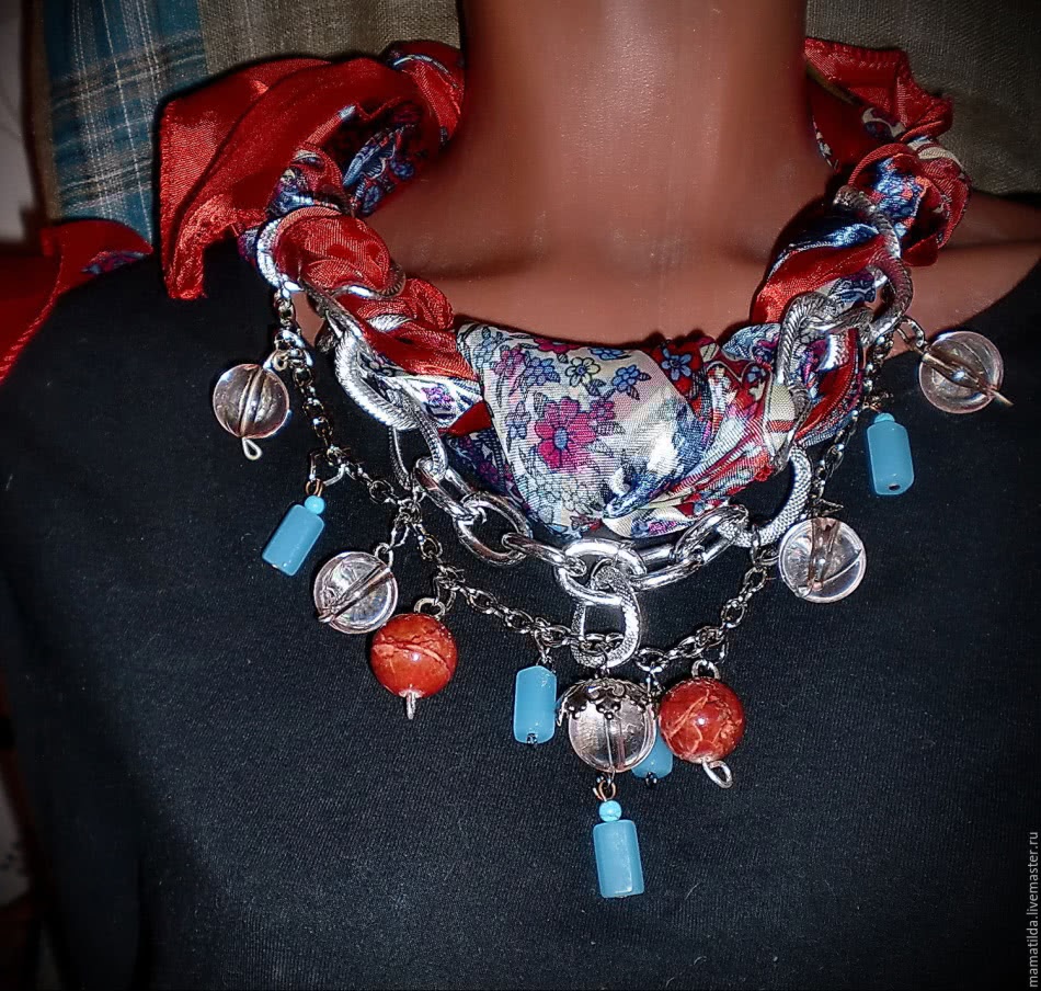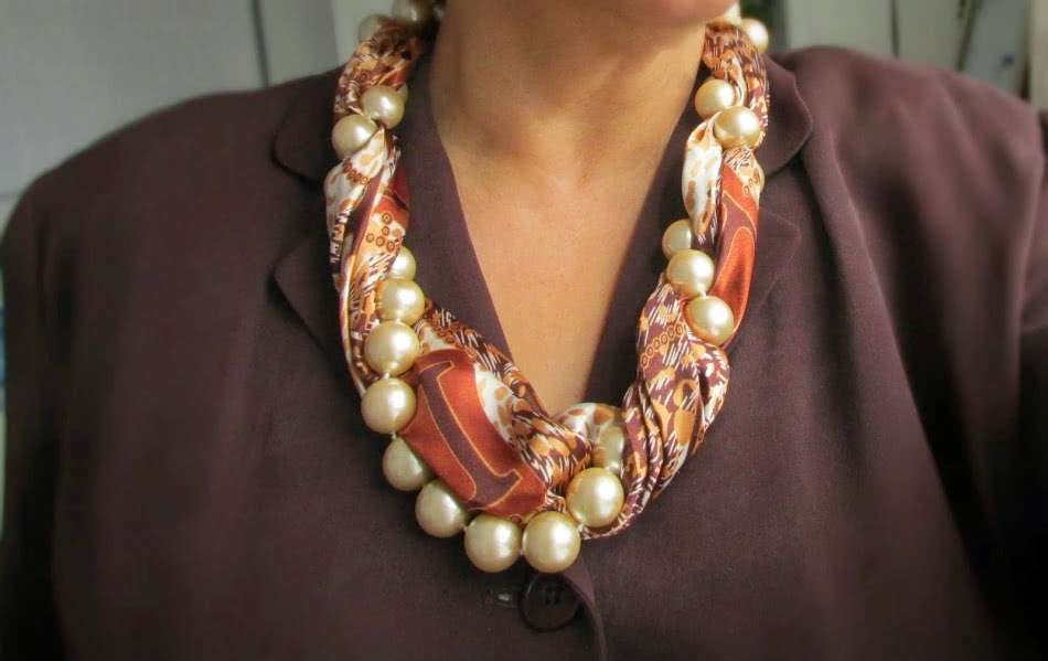 Бусы также являются превосходным украшением — платок просто оборачивается вокруг них по спирали, его концы затем завязываются