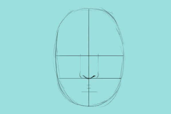 - Сначала нужно, нарисовав овал, набросать ширину лица, отметить уровень глаз горизонтальной линией, затем вертикальной линией отметить где будет находиться нос.
