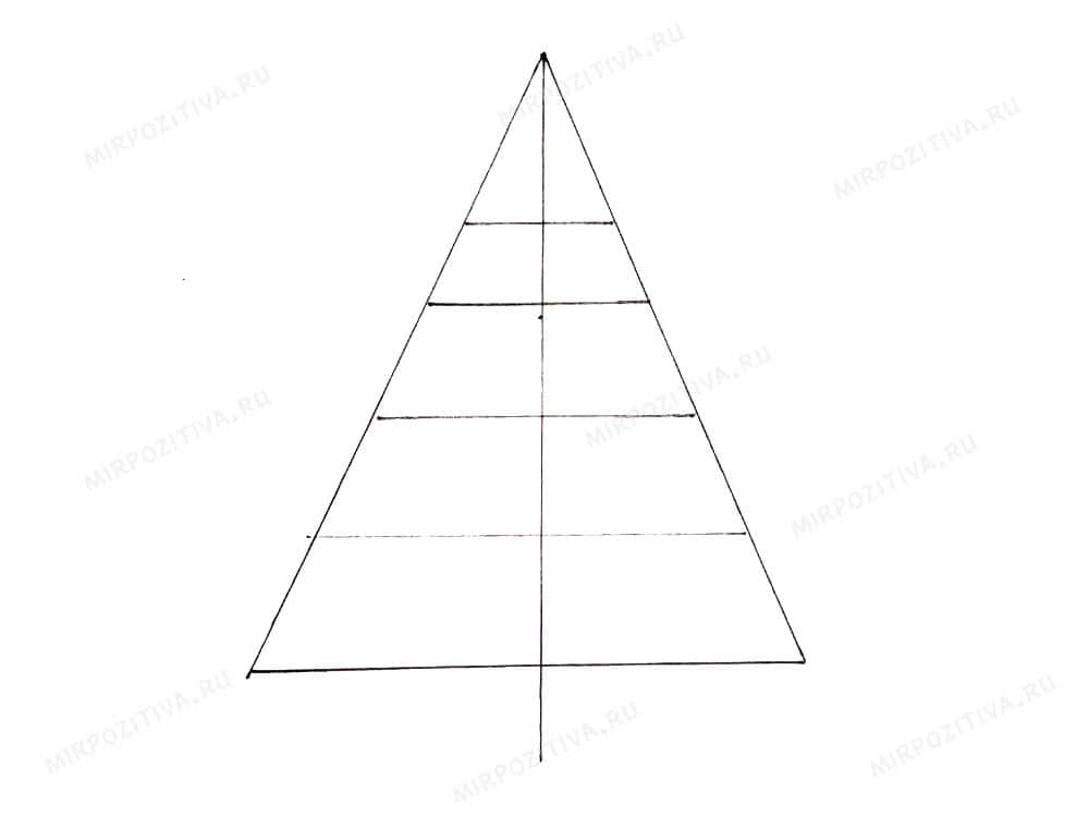 - Визуально представляем, где елочка будет размещена на листе бумаги и делаем разметку. Сначала посередине листа рисуем прямую вертикальную линию, а затем 3-4 горизонтальных. Причемгоризонтальные линии должны отличаться по длине, постепенно увеличиваясь от первой. От нижней самой длинной линии отводим две короткие косые линии, как на фото ниже.