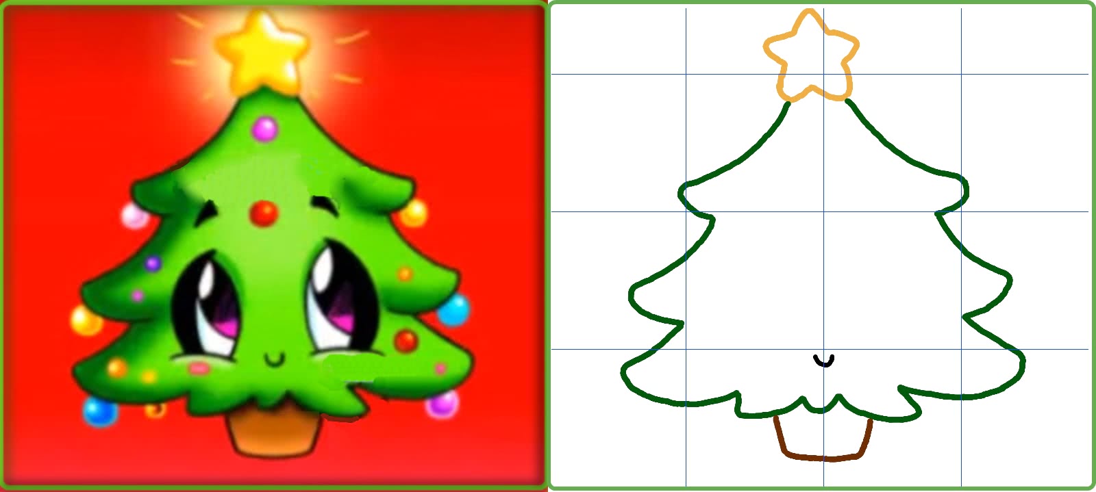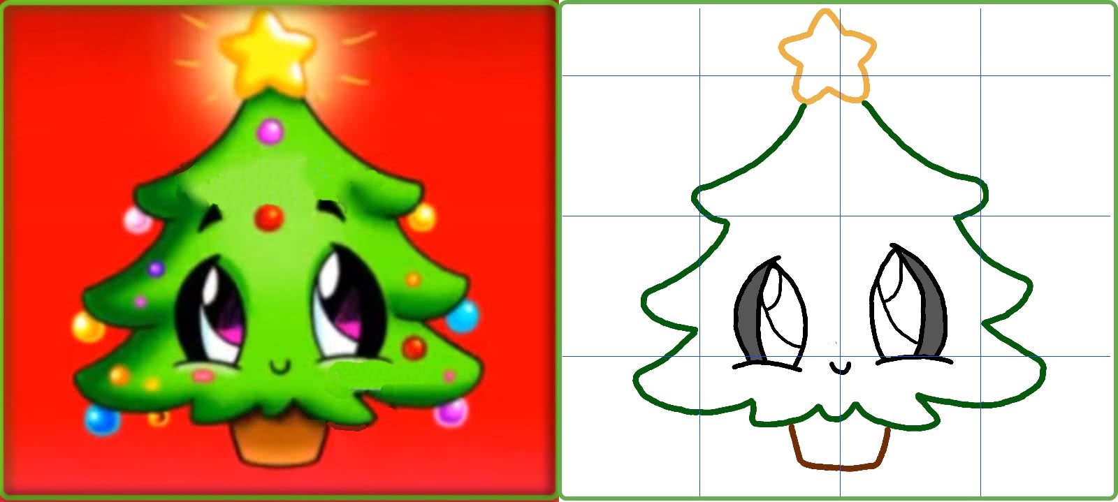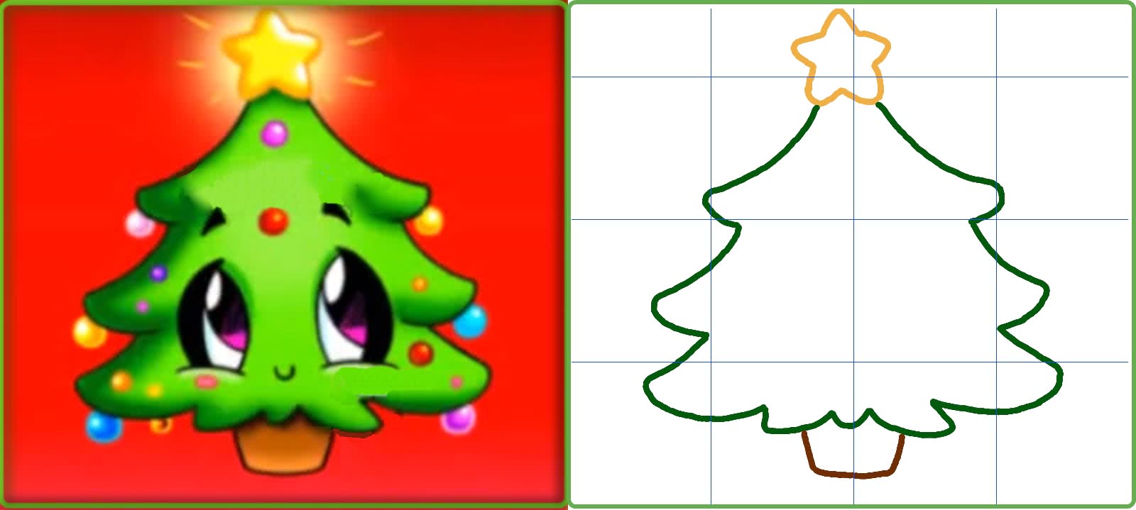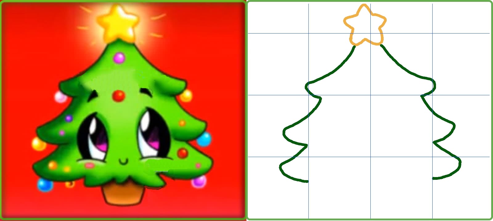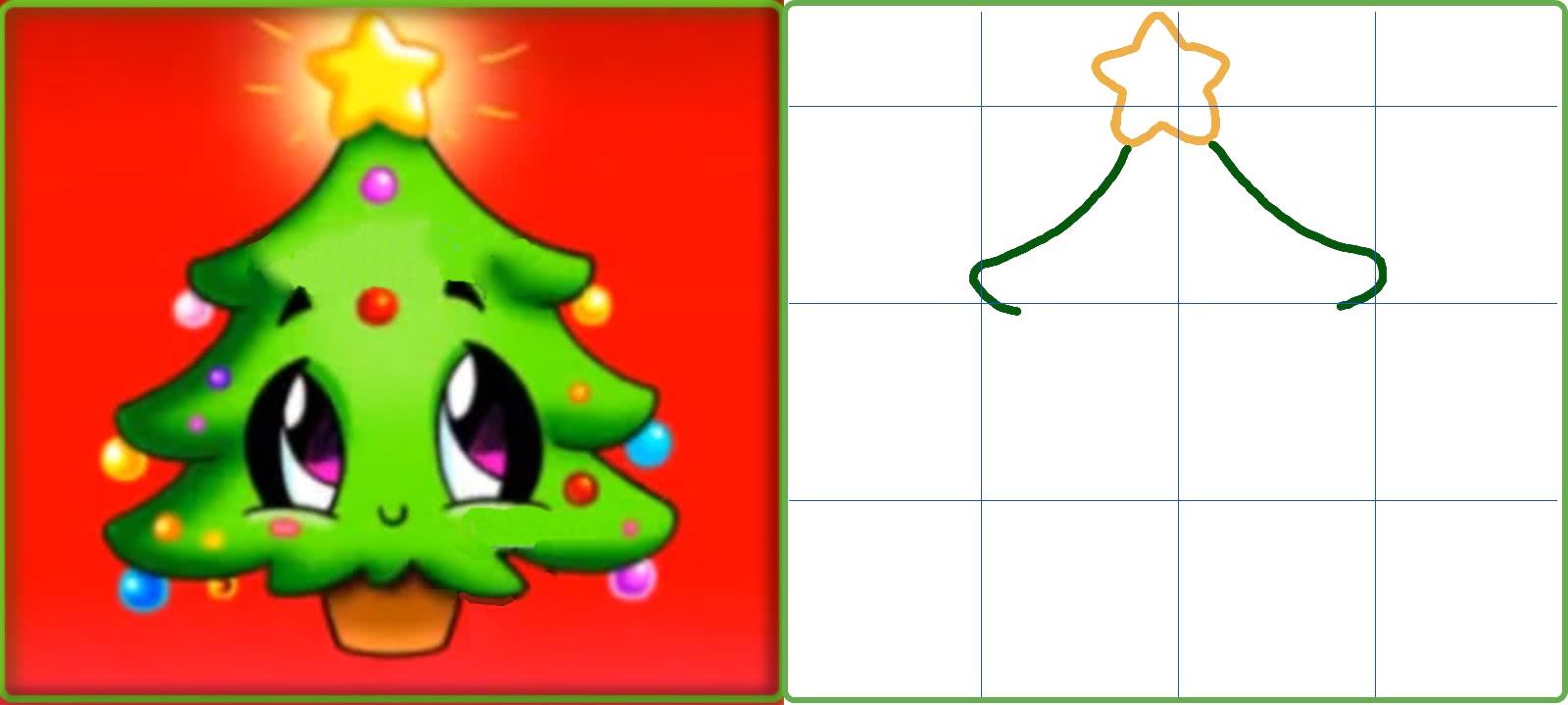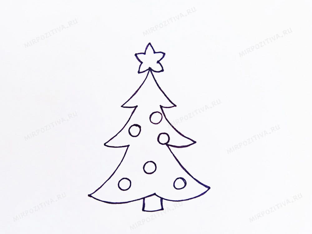 В самом верху, как раз там, где заканчивается изображенная линия, прорисовывается рождественская звезда. Она станет главным украшением и должна быть довольно большой. Так же для веселья на ней можно дорисовать глаза или смешную рожицу.
