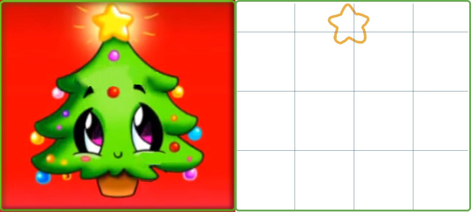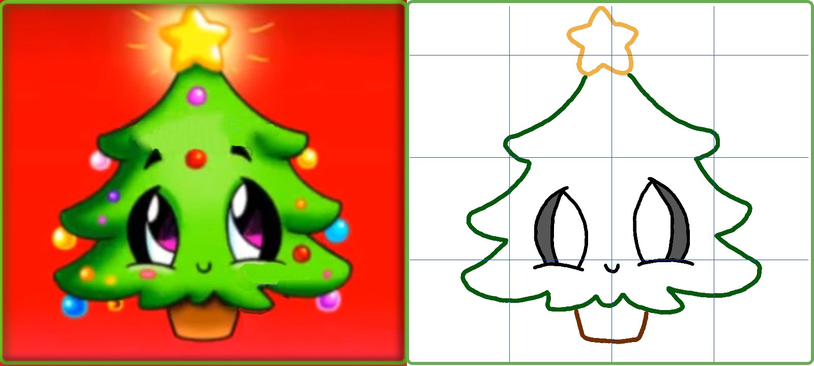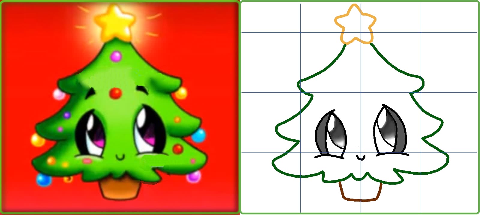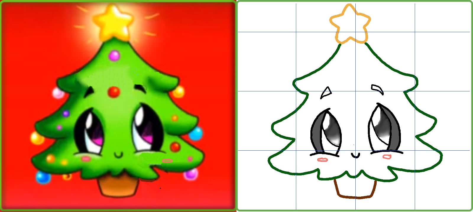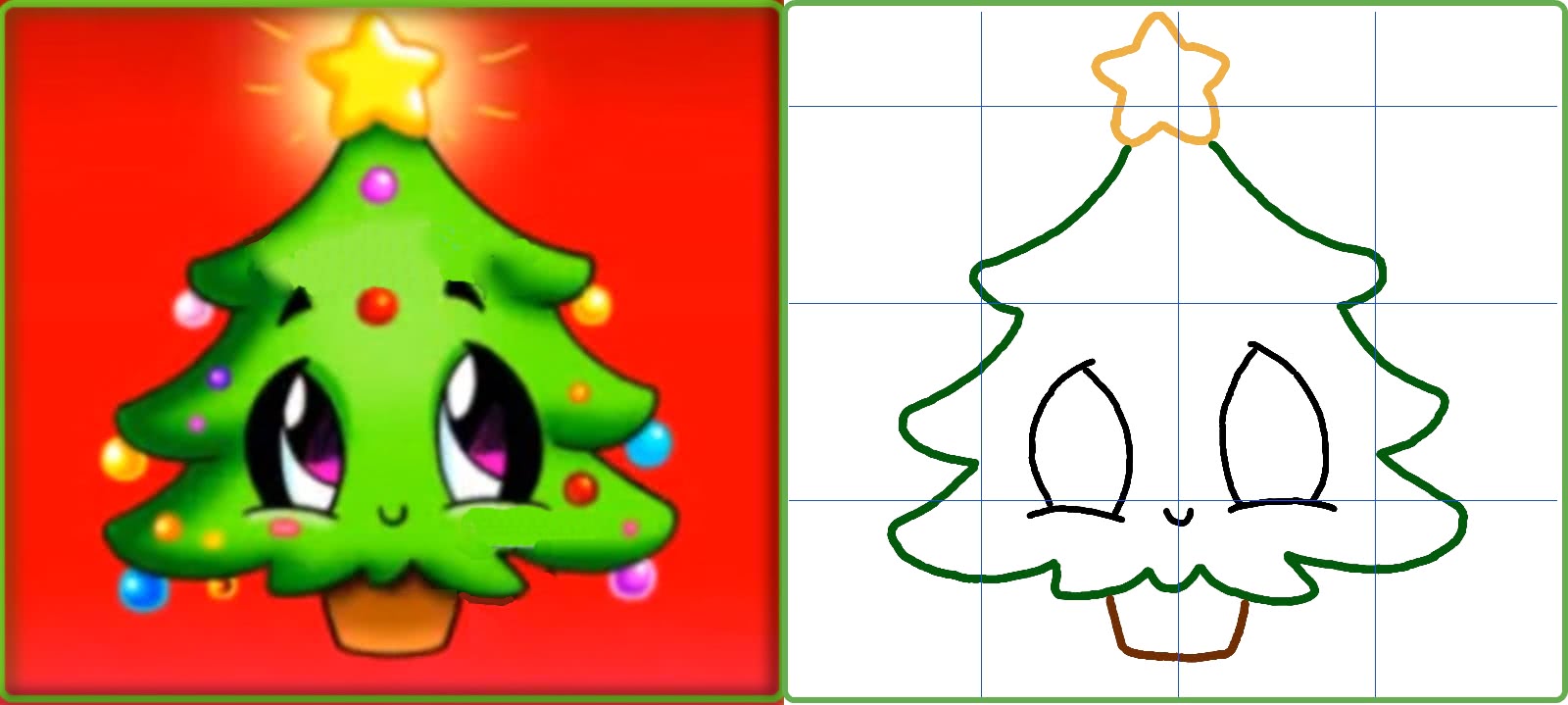 В самом верху, как раз там, где заканчивается изображенная линия, прорисовывается рождественская звезда. Она станет главным украшением и должна быть довольно большой. Так же для веселья на ней можно дорисовать глаза или смешную рожицу.