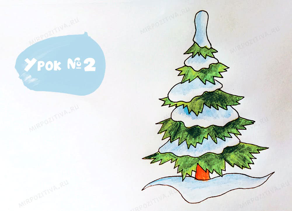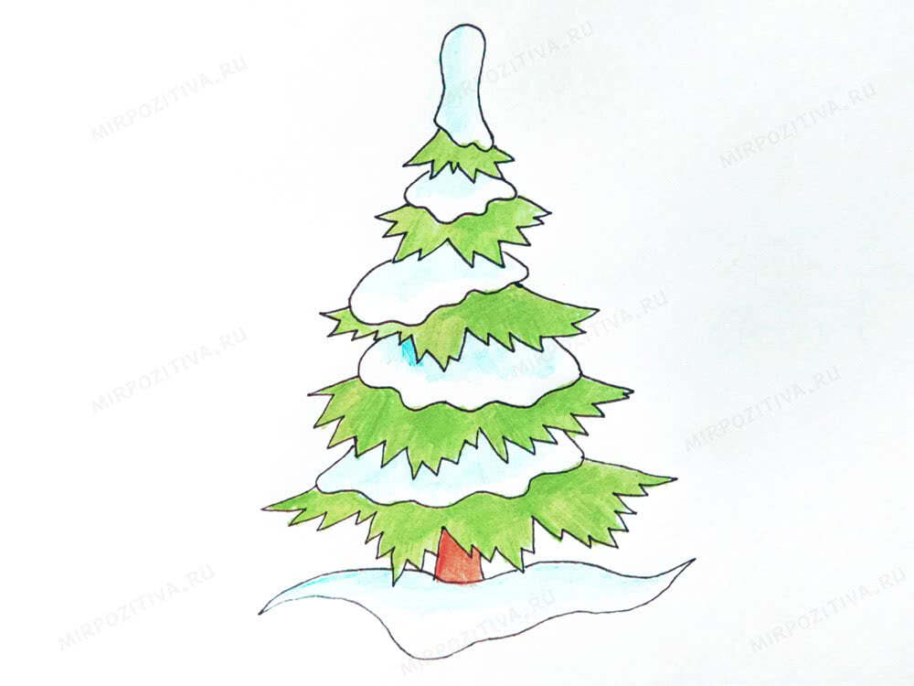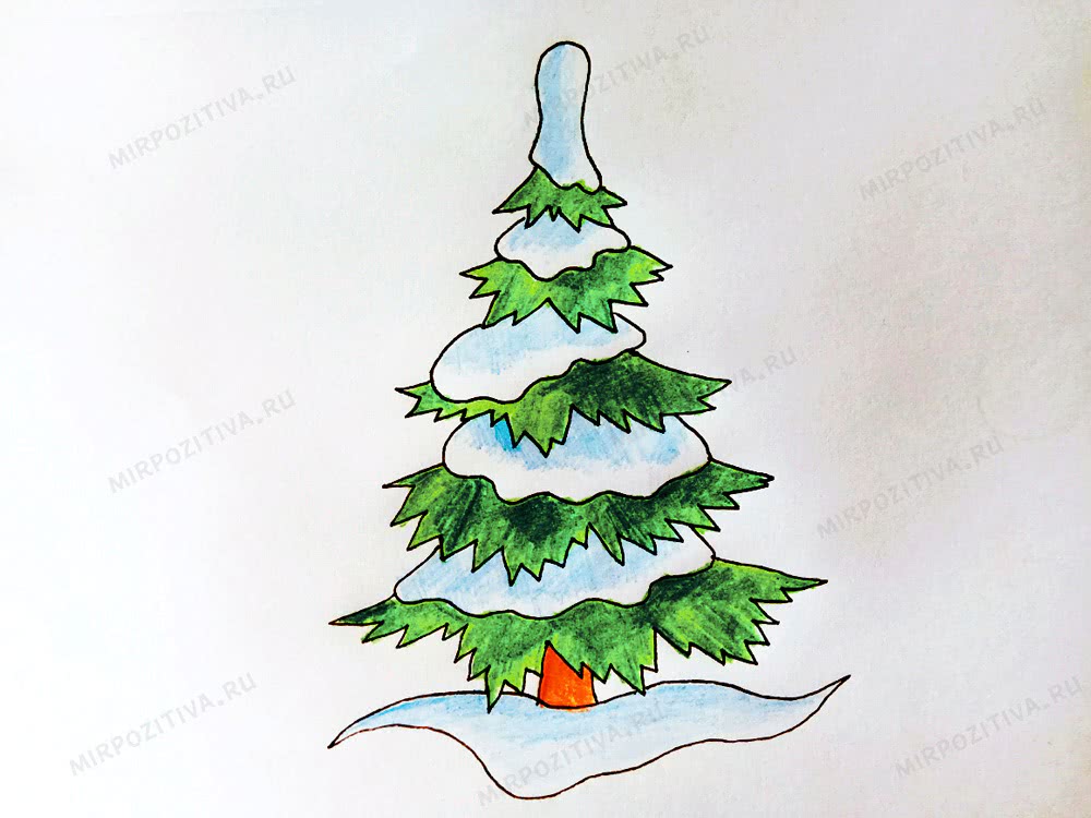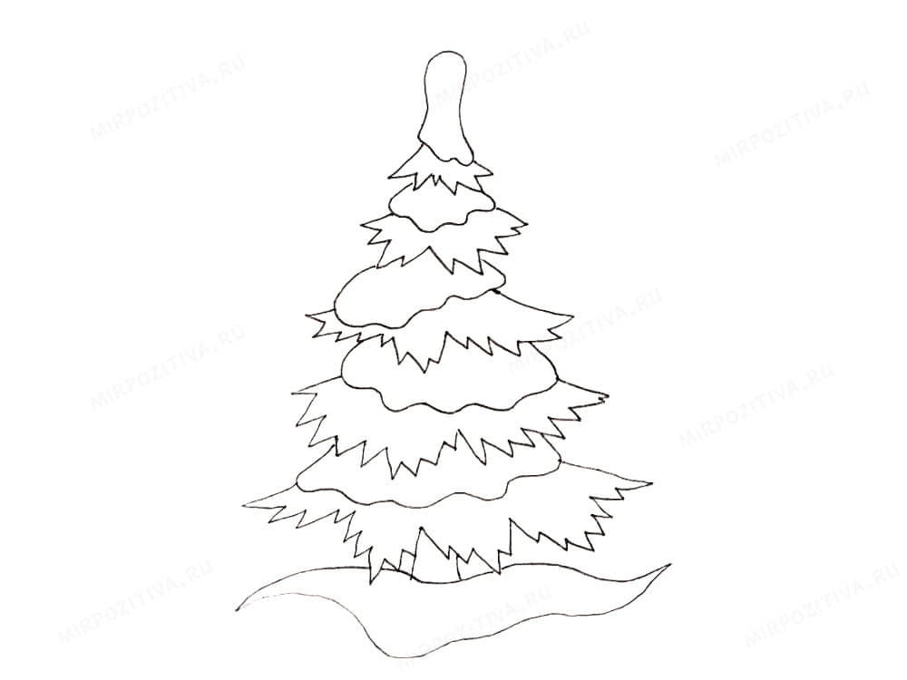 - Вытираем вспомогательные линии. Ярким черным карандашом прорисуйте все контуры дерева, снега и ствола. Между ветками добавьте несколько неровных линий. Их предназначение вы узнаете в следующем шаге.