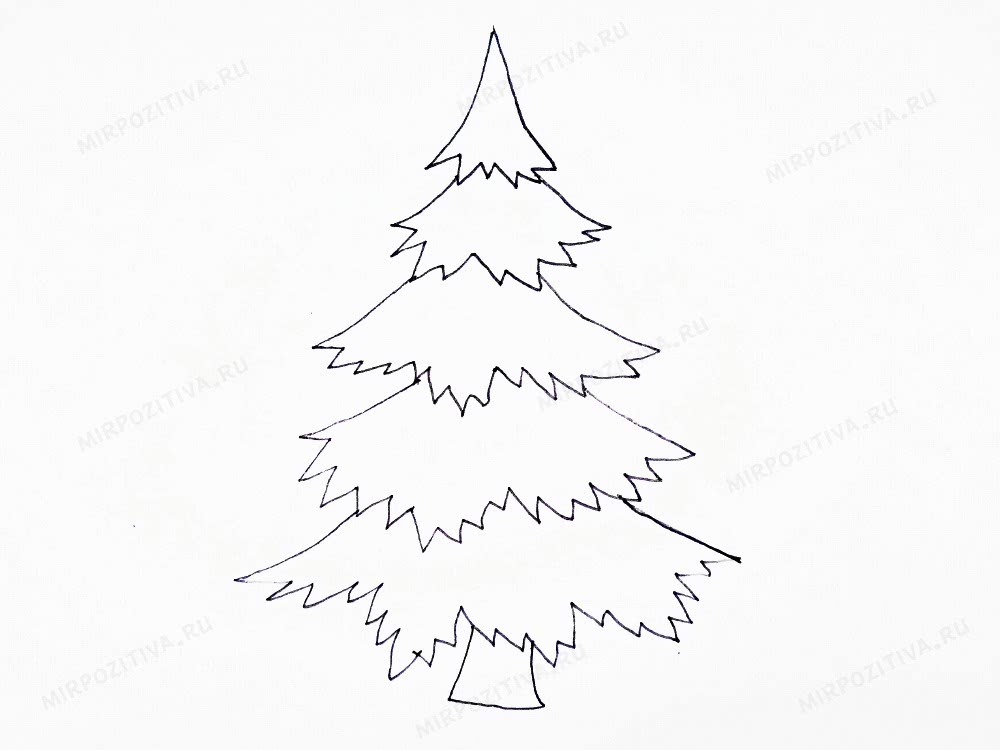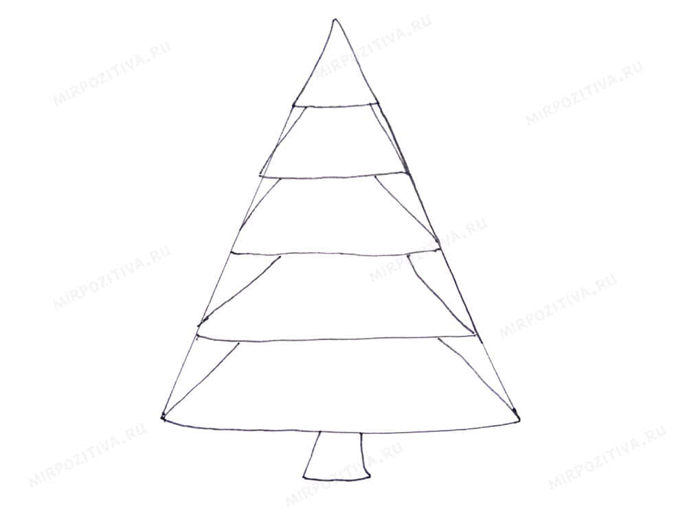 Треугольную макушку оставьте без изменений, а ниже отступите немного от верхнего края справа и слева, образуя уголки боковых еловых лап. Выделите края каждого яруса. Сотрите лишние линии.