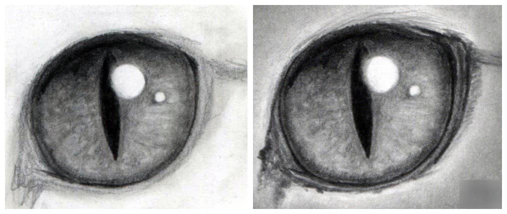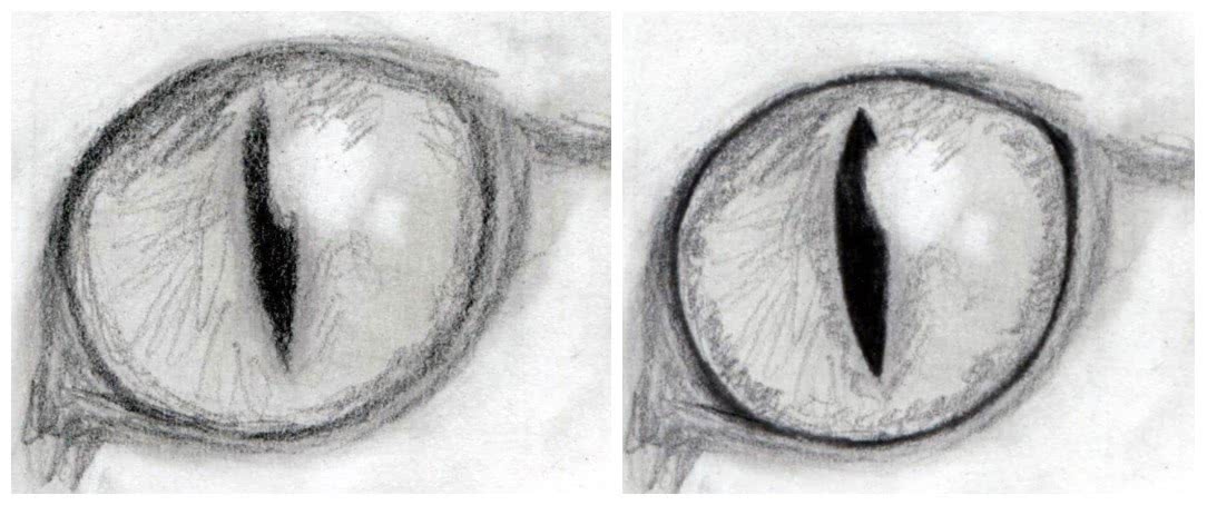 Слегка растушевывать нанесенные штрихи. Выделить блик. Края глаза с помощью штрихов разной интенсивности сделать более реалистичными.