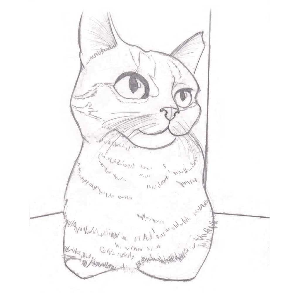 Если совсем не получается эскизы, попробуйте нарисовать кошку в графическом варианте. Тут почти все линии прямые и немного в правильном направлении штриховка.