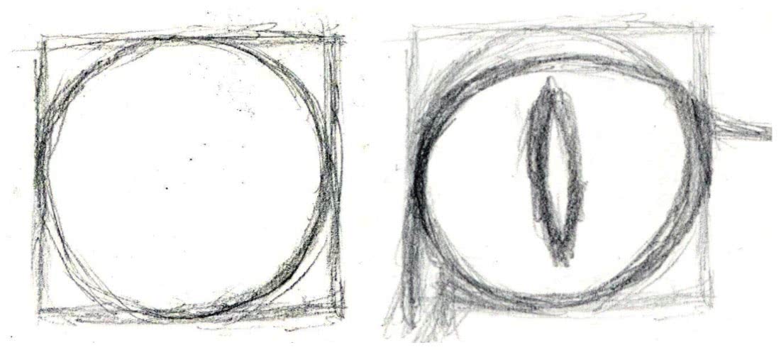Начинать следует с рисования круга, а чтобы было легче определиться с зауживаниями глазного яблока, возьмите круг в квадрат. По центру круга сделайте длинный зрачок. Вверху прорисуйте веко.
