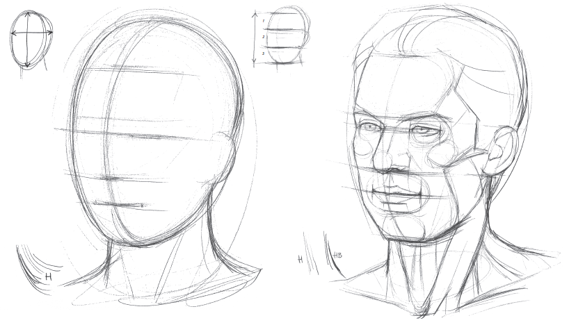 В этом положении череп будет плоской окружностью, к которой добавляются очертания челюсти, что в целом образует форму яйца, заострённое внизу. Две перпендикулярные по центру линии делят «яйцо» на четыре части. Чтобы распределить черты лица:
