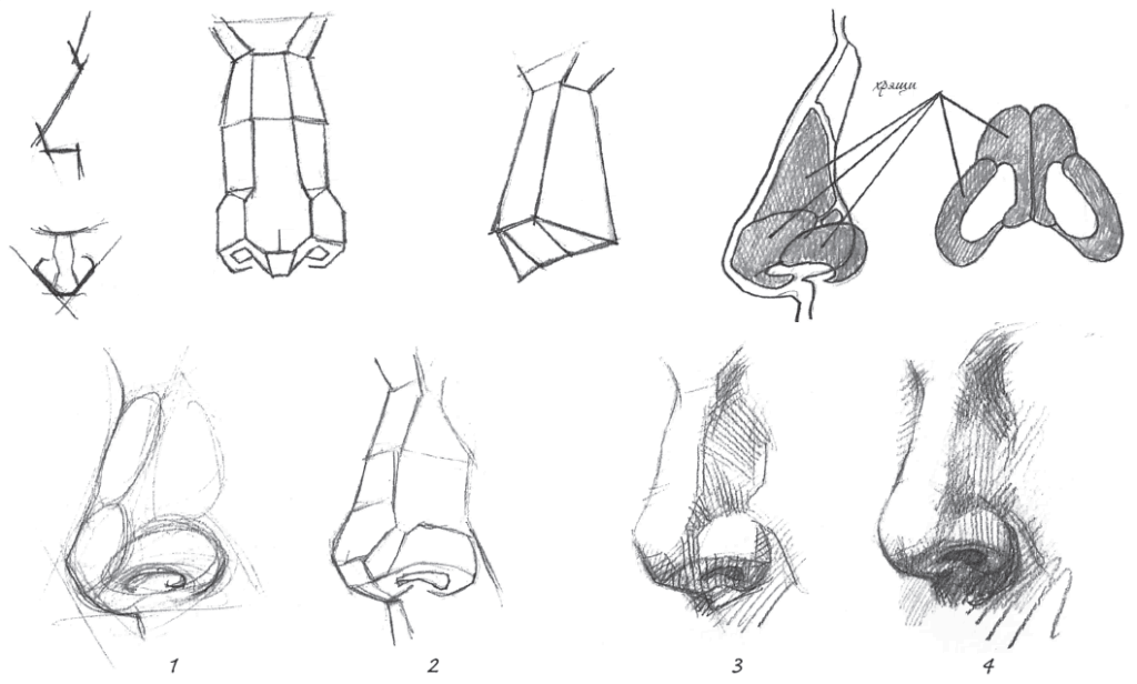 — Так как нос выдаётся вперёд, его кончик опускается ниже первоначальной отметки, поэтому кажется, что он теперь ближе к губам, а если человек опустит голову еще ниже, то ном частично закроет губы. С этого ракурса не нужно рисовать дополнительные детали носа – достаточно будет переносицы и крыльев.