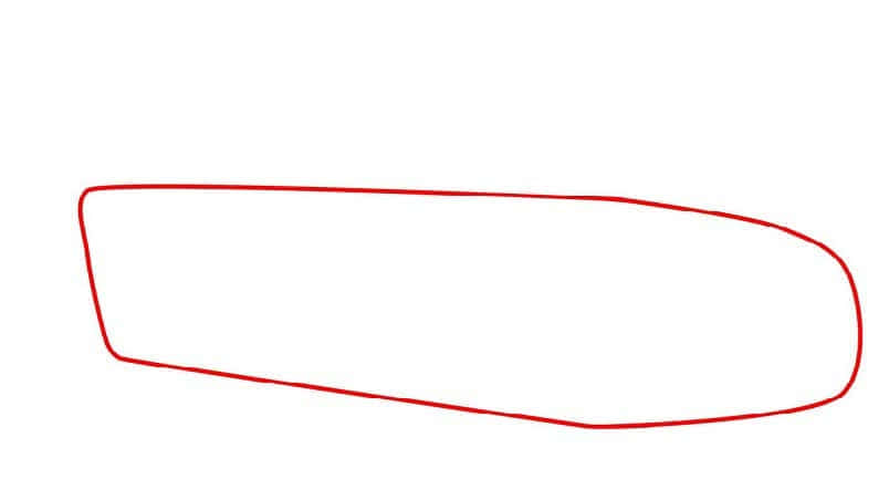 - Основное правило изображения гоночной машины — для начала передать на бумаге максимально упрощённый эскиз. В этом случае — начинаем с прорисовки корпуса вытянутой формы. Начинаем рисунок со вспомогательных линий