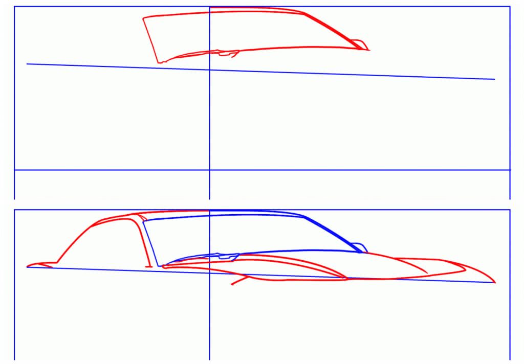 - Приступаем к крыше. Делаем два перпендикуляра переднего и среднего окон. Выводим плавной линией покатое заднее стекло. Линии лобового стекла и крыши должны быть плавными