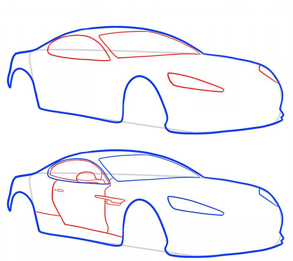 Используя простые линии нарисуйте двери и границу капота. Добавьте поворотные фары, боковые зеркала и задние фары, как показано на рисунке.