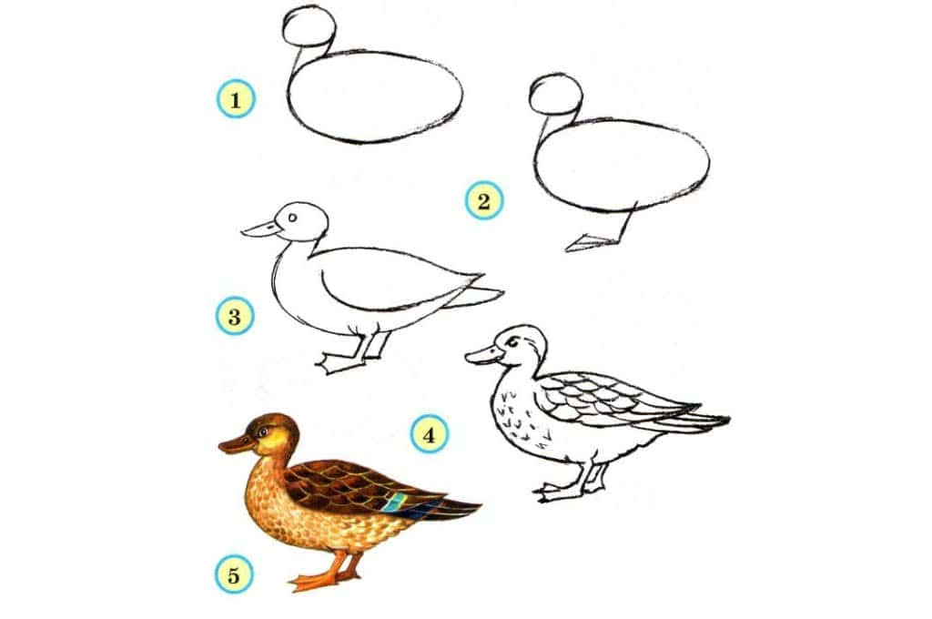 Простой пример рисования птицы. Дети любят кормить уток на прудах, любому ребенку понравится нарисовать собственную утку.
