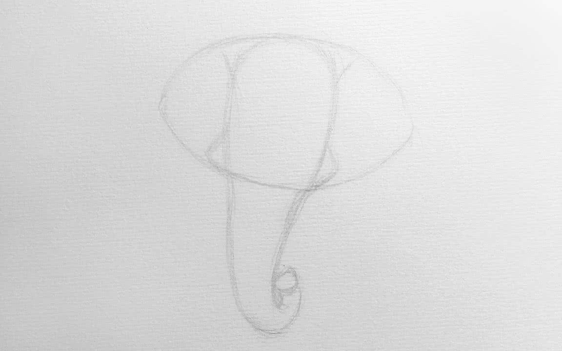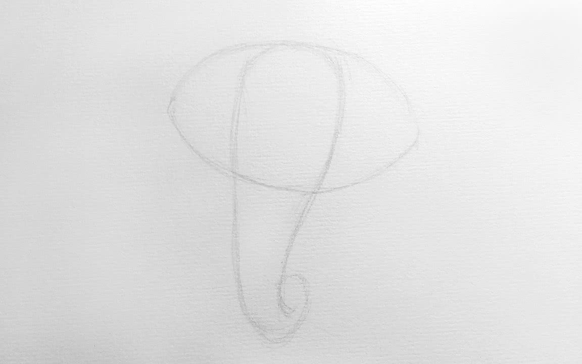 Шаг 2. Поверх овала определяем ширину головы и прорисуем хобот животного. На конце хобот немного закручивается внутрь: