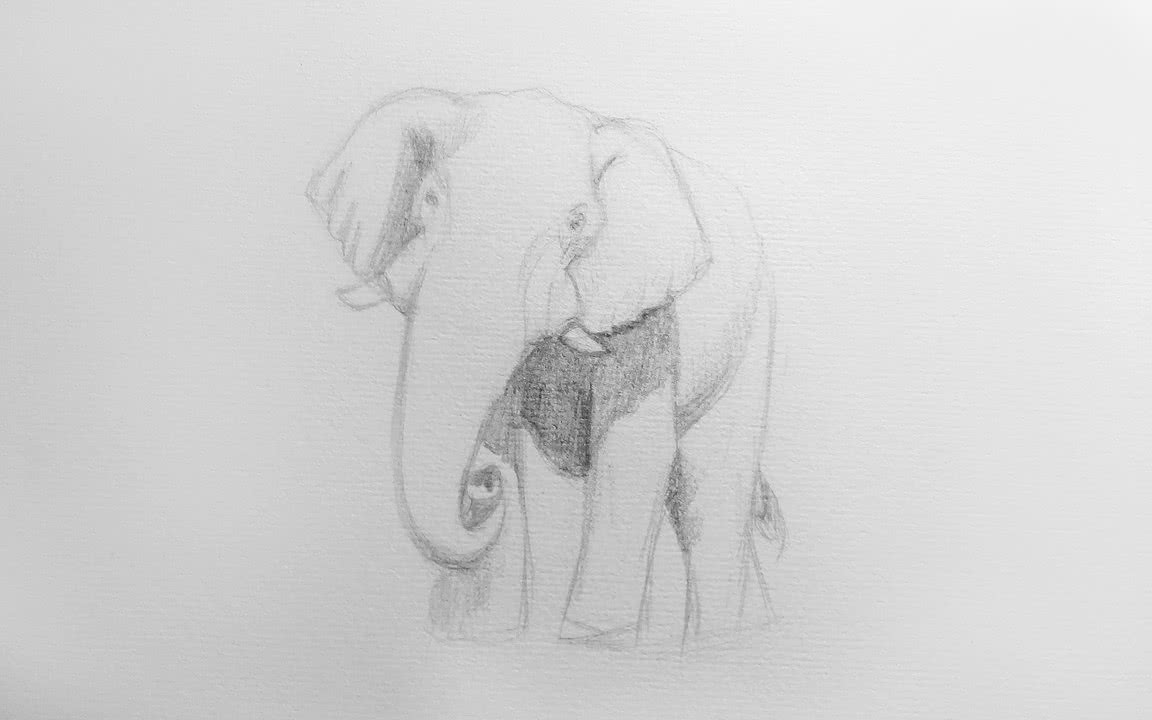 Обратите внимание, что на данном этапе уже начинается разметка штрихами и линиями, придающими объем. Хобот, живот, уши — все эти части тела должны начинать казаться объемными
