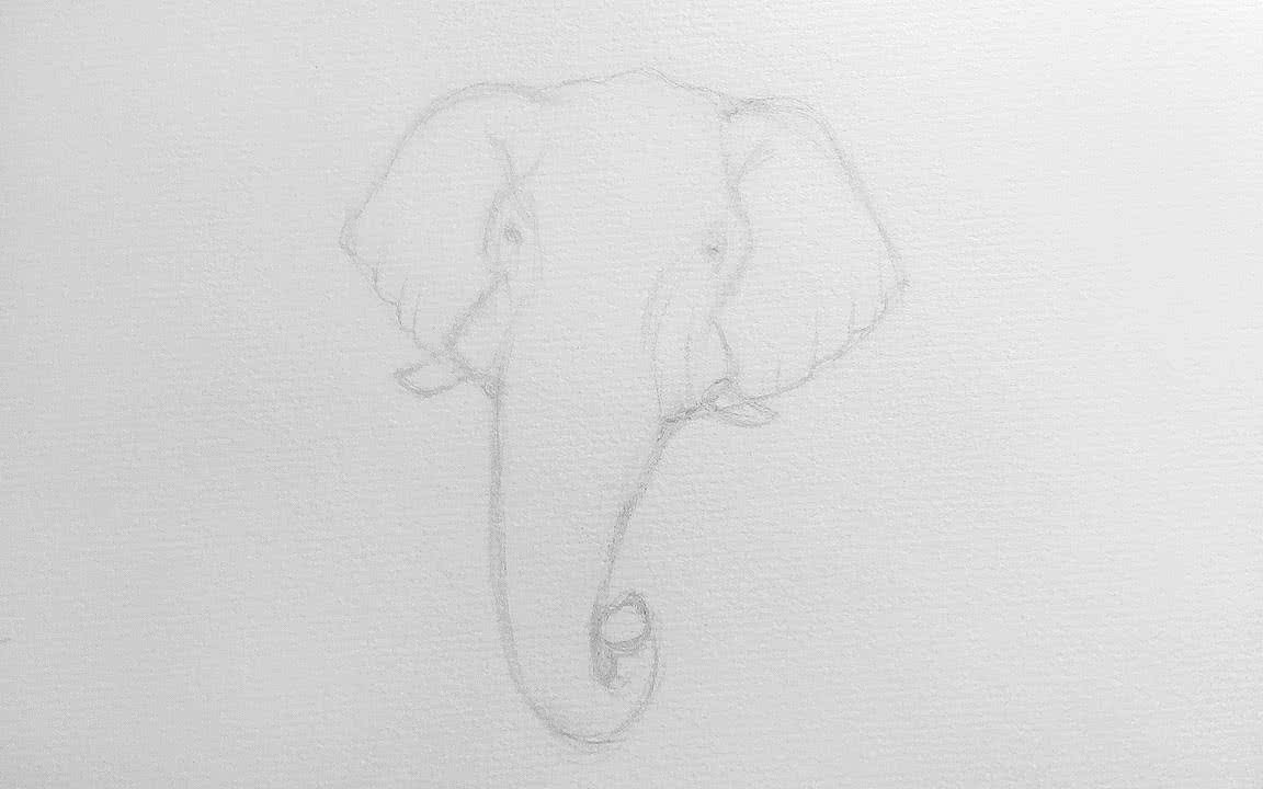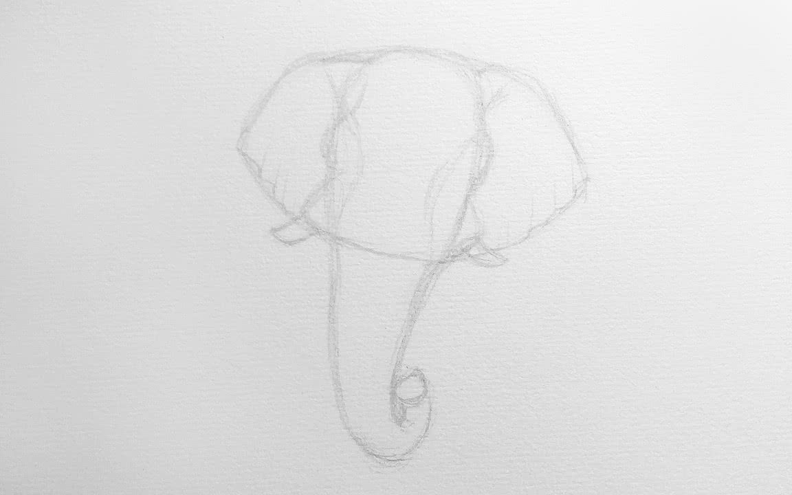 - Завершаем набросок головы слона, подрисовыванием хобота и изображением левого уха. Теперь, в нижней части головы проводим наклонную дугу, рисуем передние ноги.