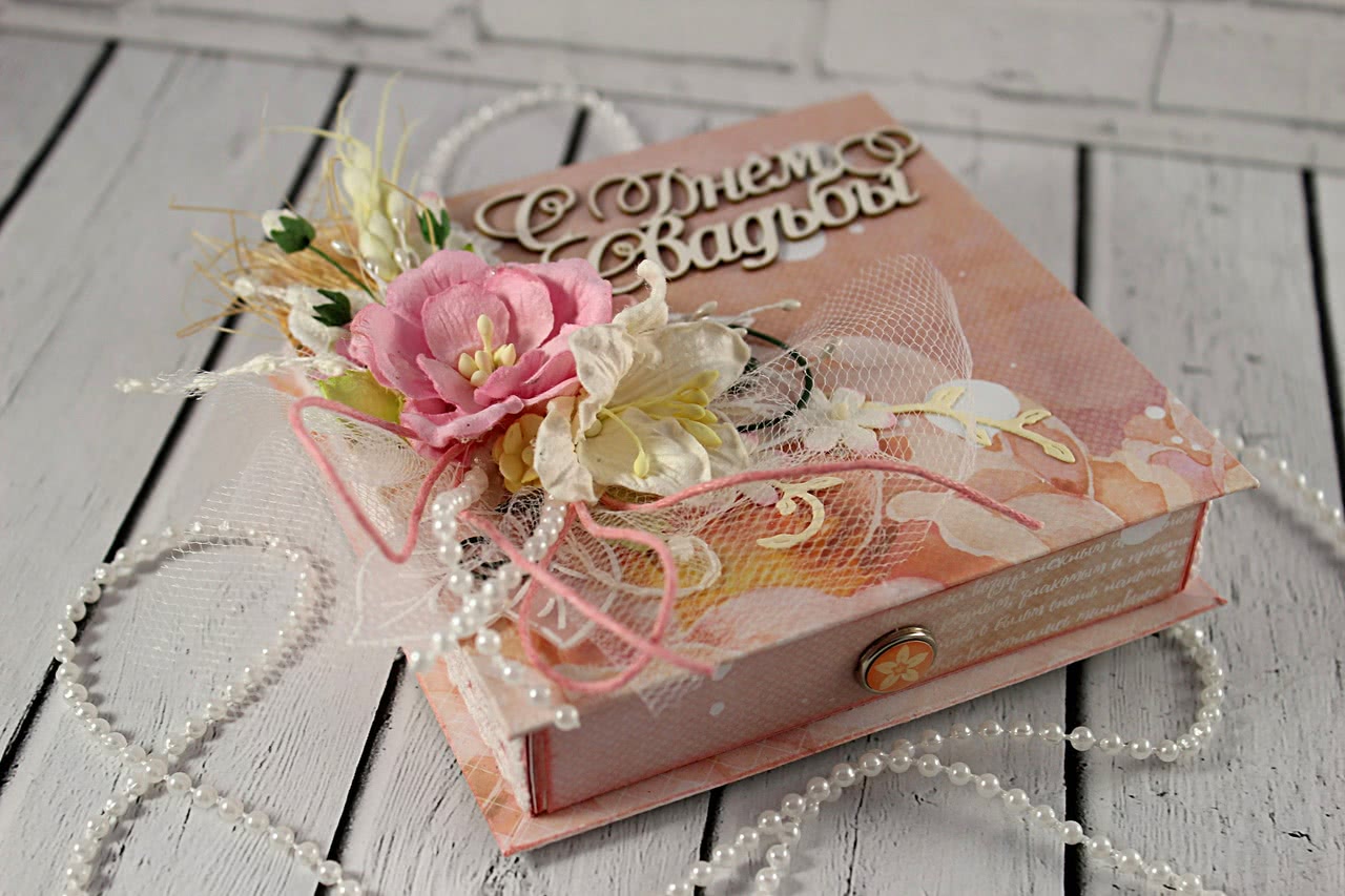 Простой и привычный вариант — конверт, но его можно сделать запоминающимся. Во-первых, можно написать искреннее пожелание на внутренней или внешней стороне, чтобы молодые понимали, от кого получили презент. Во-вторых, можно сделать упаковку своими руками. Кроме сложенного листа могут понадобиться вырезки из журналов, которыми можно обклеить поверхность.