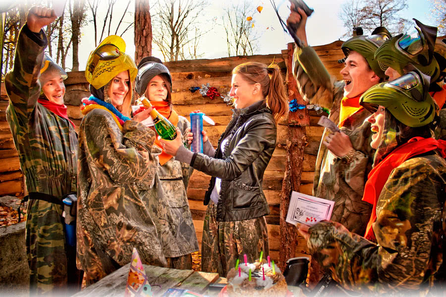 - Пейнтбол. Если друзья – ярые любители острых ощущений, то пейнтбол – это свежая мысль, как отметить день рождения дешево и весело. Платить придется только за посещение площадки дружной компанией, зато несколько часов веселья и игры позволят незабываемо и зрелищно провести этот праздник, организовать боевую фотосессию.