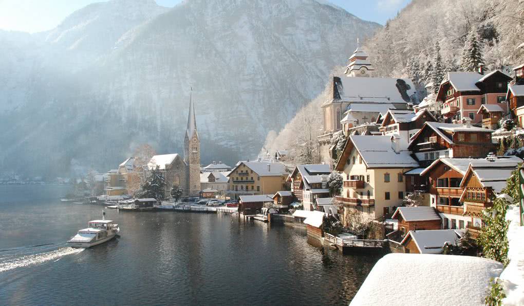 Посетите удивительный городок Гальштат в Австрии. Он расположен на берегу реки, но кроме этого его окружают горы.