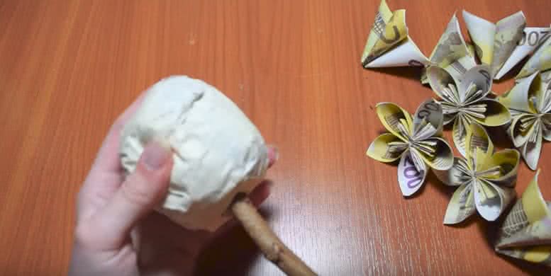 Выглядит такая поделка очень необычно и привлечёт к себе внимание всех гостей. Для этого достаточно приобрести небольшой брусок и, скрутив купюры, сделать из них импровизированные листья