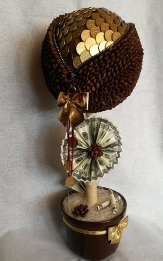 Еще один вариант того, как можно сделать деньги подарком — собрать из них топиарий. Топиарием называется искусственное интерьерное деревце, которое может изготавливаться совершенно из разных топиариев. Учитывая, что это кропотливая ручная работа (и денежные топиарии по поверьям еще и привлекают в дом богатство), получателю будет очень приятен такой сюрприз.