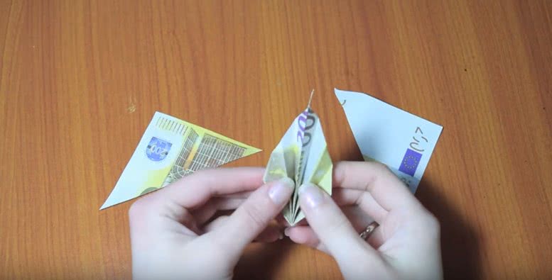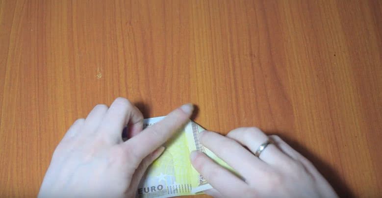Тем временем займемся изготовлением лепестков для дерева. Берем купюру и складываем ее в треугольник, загнув края к центру. Обрезаем лишнее.