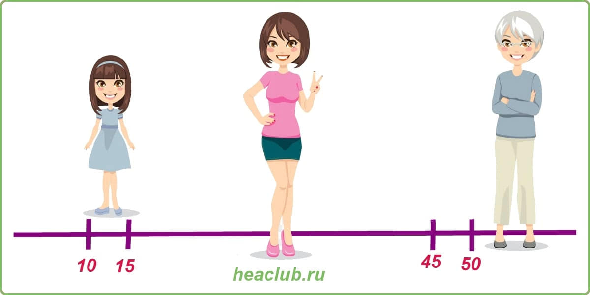 С 15 до 50 лет женщина в активном репродуктивном возрасте. Упражнения могут варьироваться в зависимости от фазы менструального цикла. Иногда в первые дни они направлены на то, чтобы ускорить отторжение эндометрия. Во второй фазе перед овуляцией — период, в котором активнее откладываются жировые отложения и некоторые техники помогают это исправить. В третьей фазе, под влиянием прогестерона снижается прочность соединительной ткани, и существуют специальные упражнения помогающие нивелировать даже это.